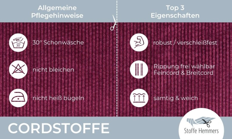 Corduroy stof kan probleemloos gewassen worden, is weinig kreukgevoelig en rafelt bij een goede afwerking niet uit.